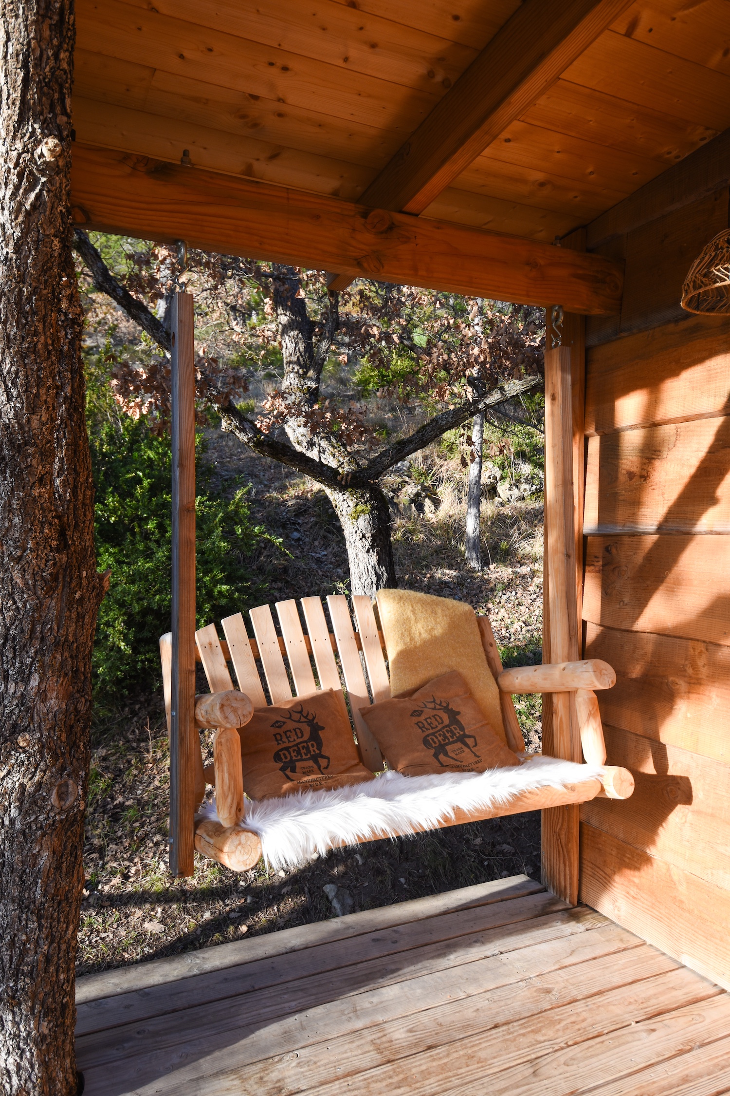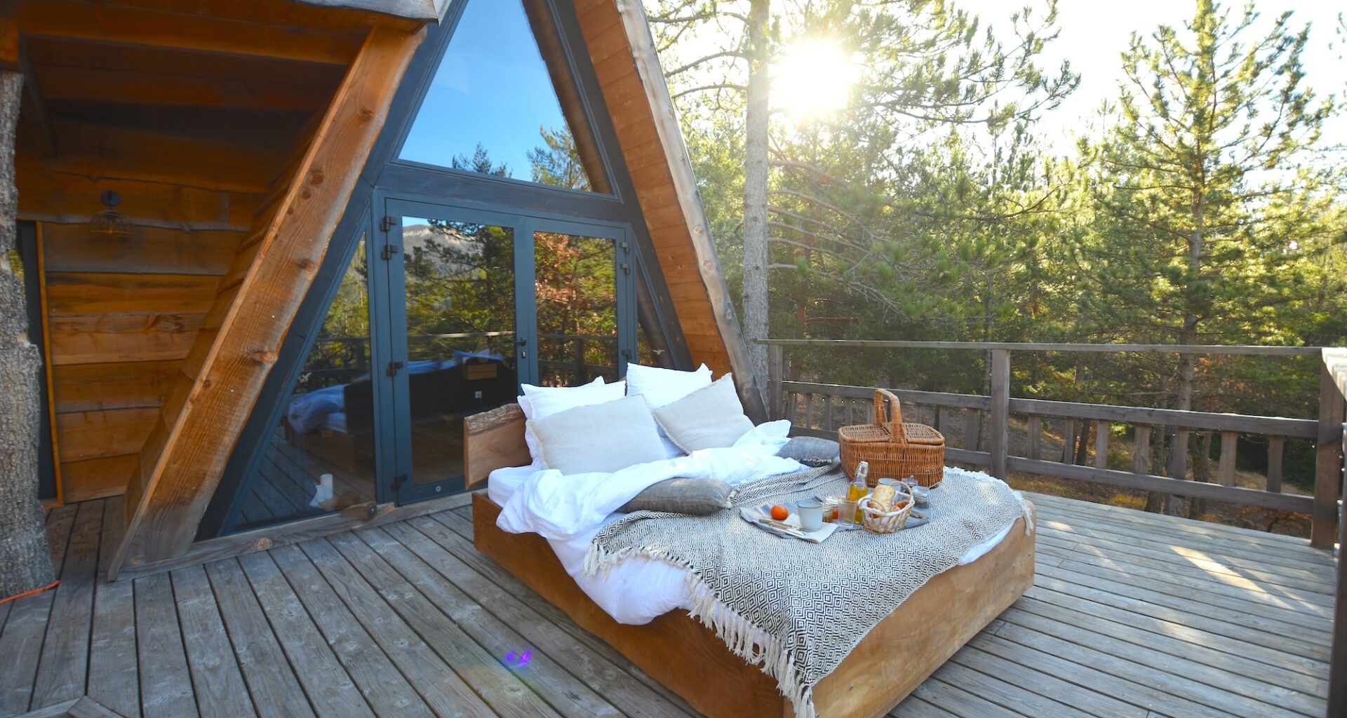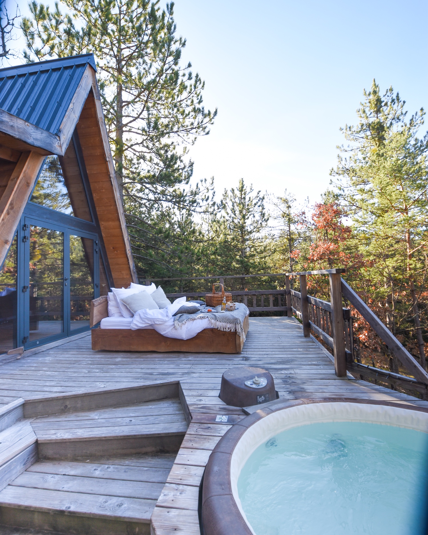 Mais ce qui rend cette cabane vraiment exceptionnelle, c’est la possibilité de sortir le lit sur la terrasse. Oui, sortir le lit. Dormir sous les étoiles ou faire une sieste au soleil du printemps qui arrive doucement… C’est le genre d’expérience rare qui marque. Nous avons vécu ce moment suspendu, blottis sous la couette avec l’air frais et le ciel au-dessus de nous. Rien que pour ça, le séjour restera gravé.