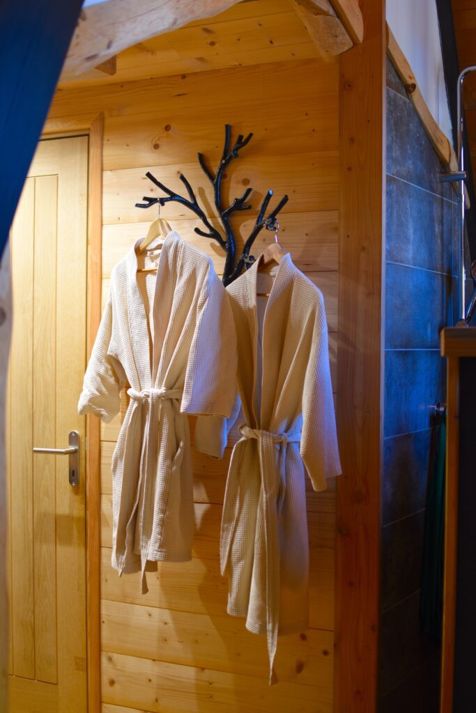 La cabane est également équipée d’une belle salle d’eau avec douche et toilettes, moderne et confortable. Il n’y a pas de coin cuisine, mais honnêtement, cela ne manque pas du tout : tout est pensé ici pour un séjour 100 % repos, où l’on se laisse porter. Et justement, je vous en dis plus sur les services juste après…